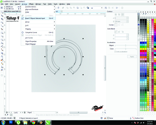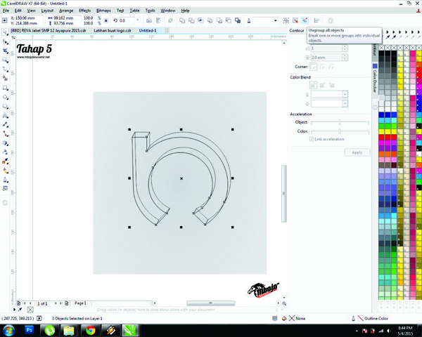 Masuk tahap kelima adalah semua layer di “Ungroup”, setelah tadi sudah di break object, sobat mbojo harus Ungroup lagi, karena jika belum, nanti ketika membuat gradasi warna, object utama (awal) masih menyatu dengan object 3D nya. Bisa sobat mbojo klik Icon di gambar berikut ini
